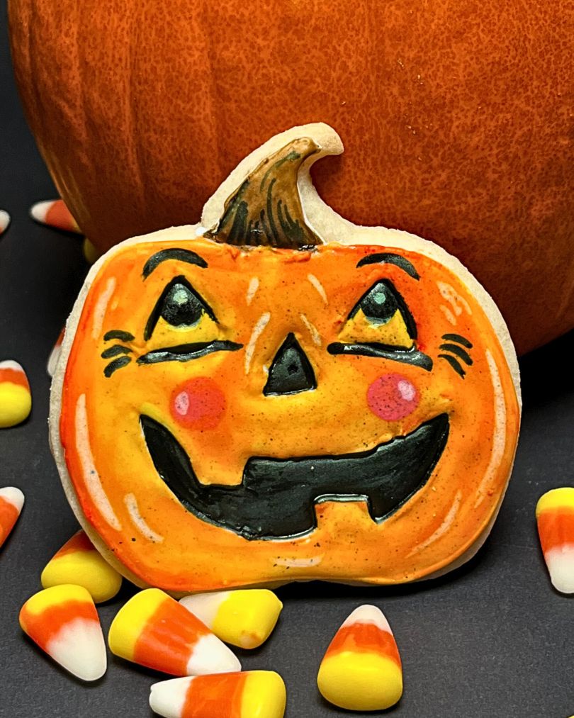 These jack-o-lantern sugar cookies are made from scratch with quality ingredients, piped with royal icing, then decorated with a unique hand-painted touch.